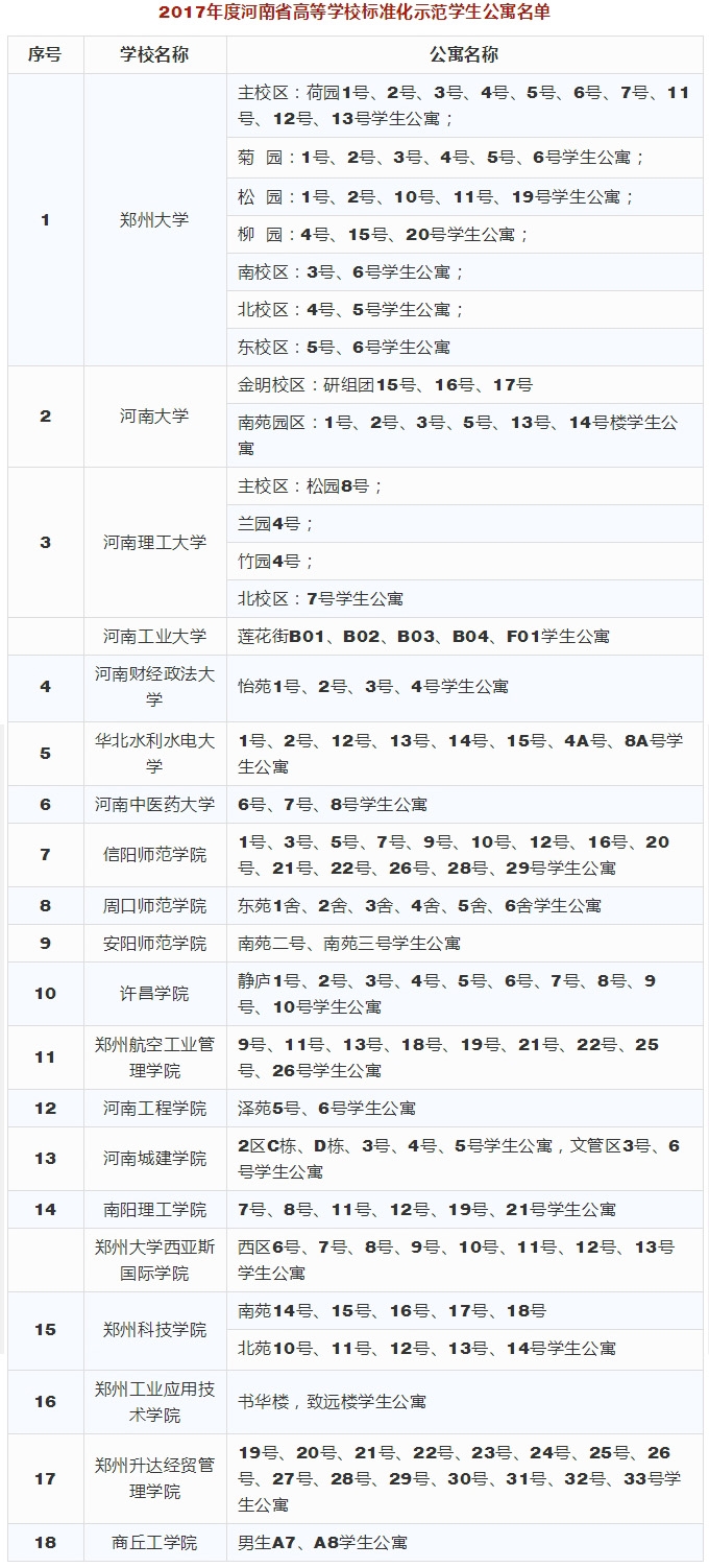 根據**組推薦結果,經研究,4月23日,河南省教育廳對2017年度河南省高等學校標準化學生公寓和標準化學生食堂評審結果進行了公示。快看你家學校公寓和食堂入選了沒!